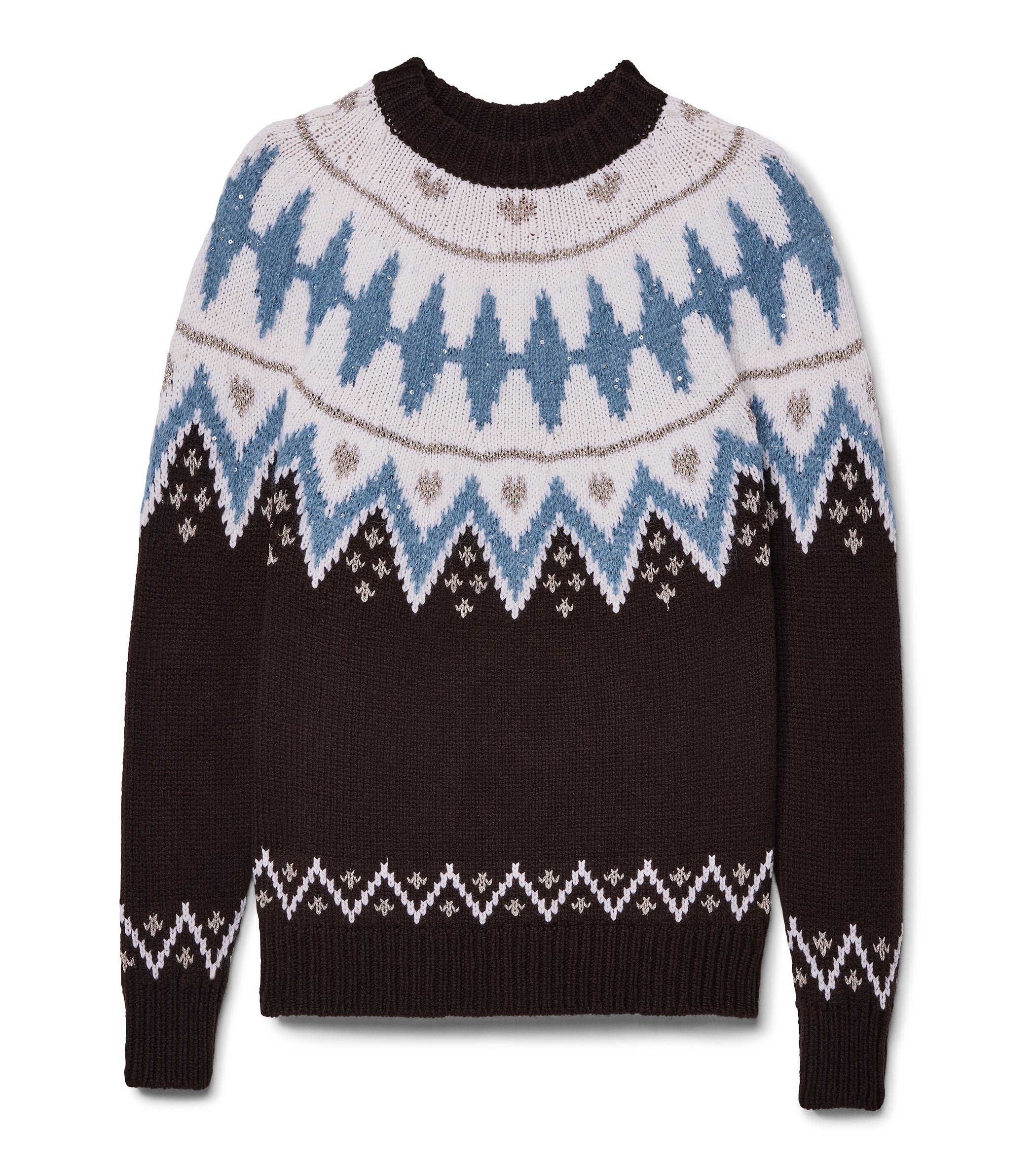 Le Lion's take on a fair isle is here and it is packed with sequin and sparkle. Combining 4 different Italian yarns, this fair isle is truly unique. Throw this on for ultimate coziness all winter long.